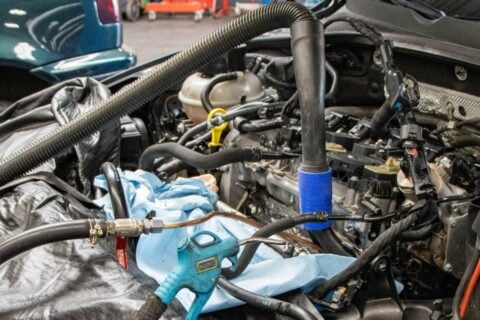 De reinigingsapparatuur inclusief de afzuiging voor de koolresten wordt aangesloten. Voor de inlaatpoort gebeurd dit met behulp van het monteren van een speciale afzuigmond. Het proces kan beginnen en dit wordt herhaald per uitlaatpoort.